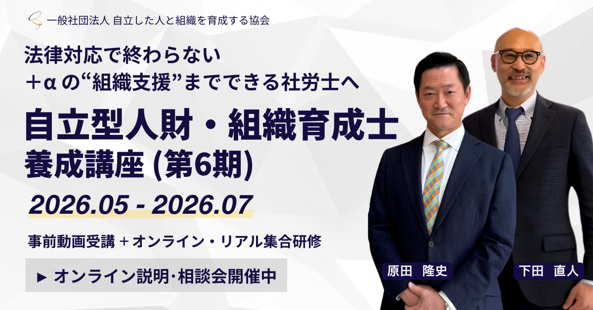 【2026年5月開講の「自立型人財・組織育成士 養成講座(第6期)」の受講募集開始】 講座の内容や進め方を詳しく知りたい方、個別の疑問を解消したい方に向けて、 無料の説明・相談会を開催しています。 日程は随時更新しておりますので、ご都合の良い回に是非ご参加ください。 |